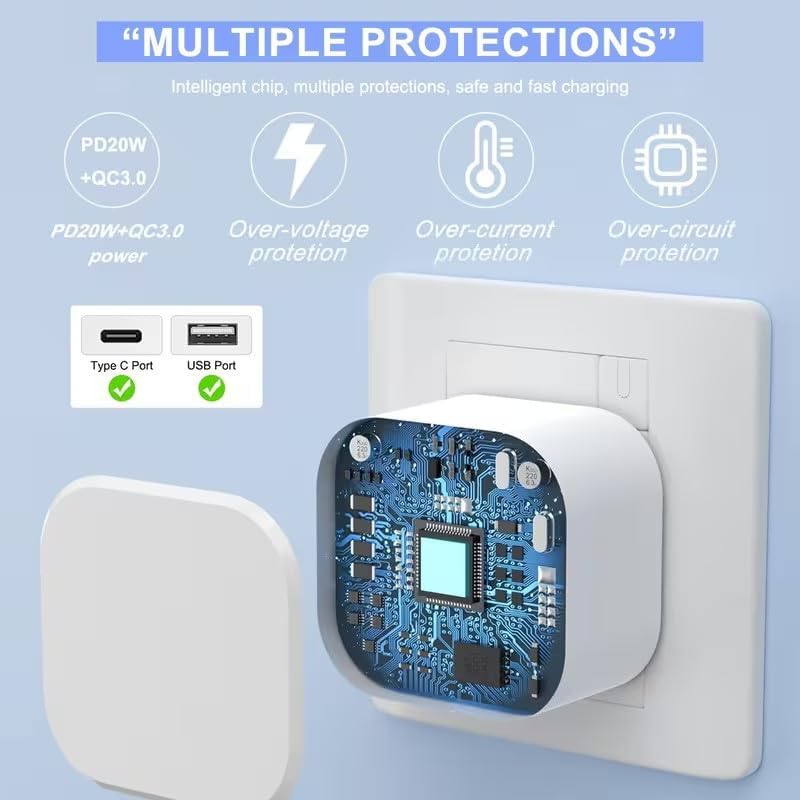【20W Dual Ports Fast Charging】2 in 1 Wall Charger is designed with fast charging ports, USB-C port and USB-A port to meet your different demands. For example, you can charge iPhone 17/17 Pro/17 Pro Max/iPhone Air/16e/16/16 Plus/16 Pro/16 Pro Max/15/15 Plus/15 Pro/15 Pro Max/14/14 Plus/14 Pro/14 Pro Max/13/13 Pro/13 Pro Max/13 Mini/12/12 Pro/12 Pro Max/12 Mini/SE 2022 from 0-65% in about 30 minutes, and fully charge in 95 minutes.