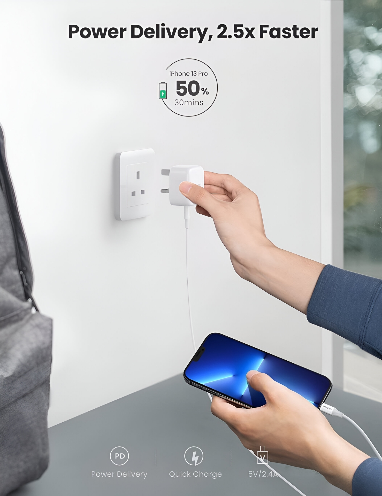 Plug the 20W USB‑C power adapter into a wall socket.