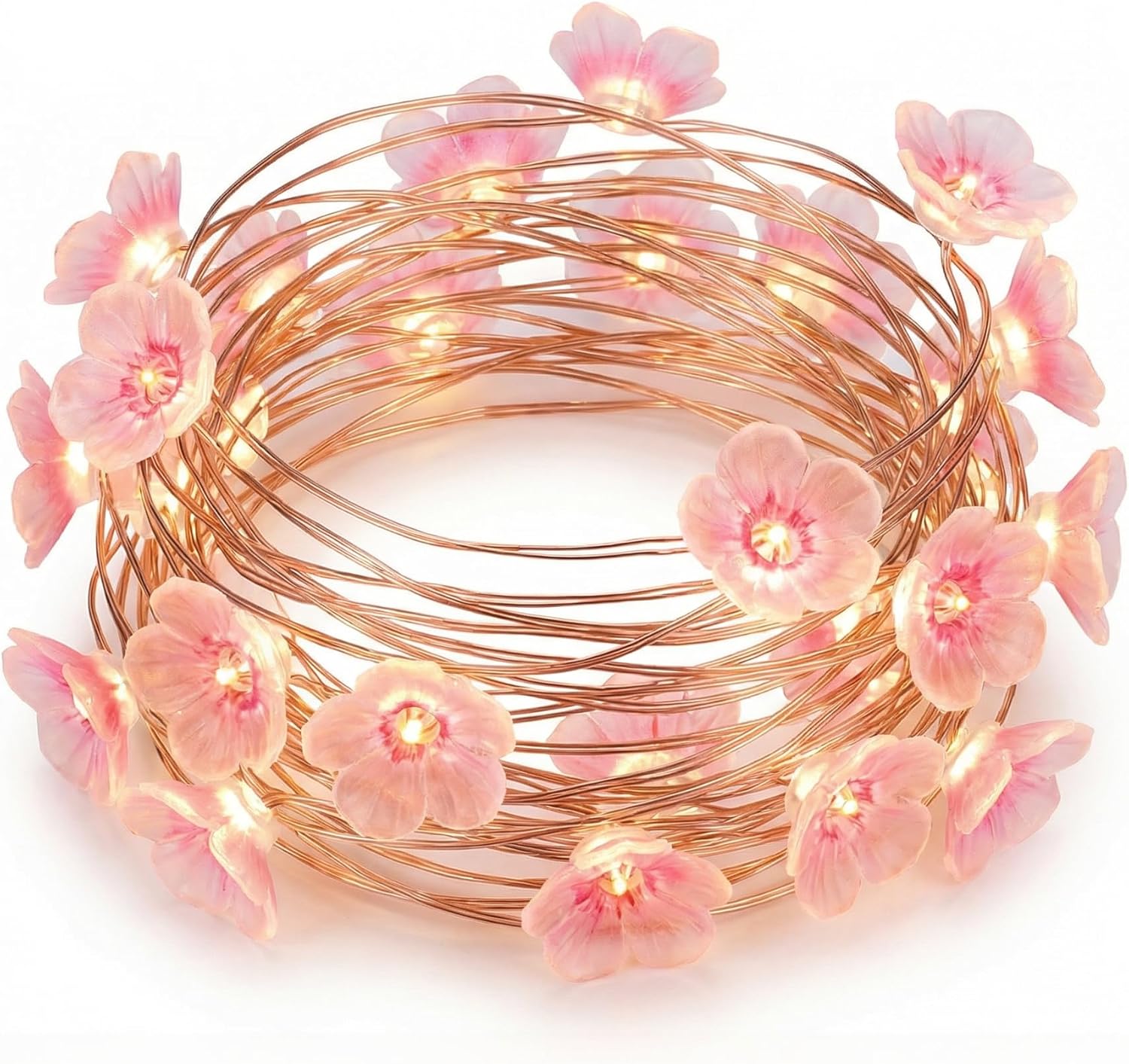 Add a soft and romantic glow to your space with these pink cherry blossom LED fairy lights, designed to create a calming and elegant atmosphere. Featuring 20 warm white LEDs nestled inside delicate pink flower petals, these floral string lights are perfect for bedroom decor, wall styling, and seasonal decorations. The gentle illumination combined with the charming blossom design makes them ideal for creating cozy, aesthetic environments in living spaces, dorm rooms, or special occasions.