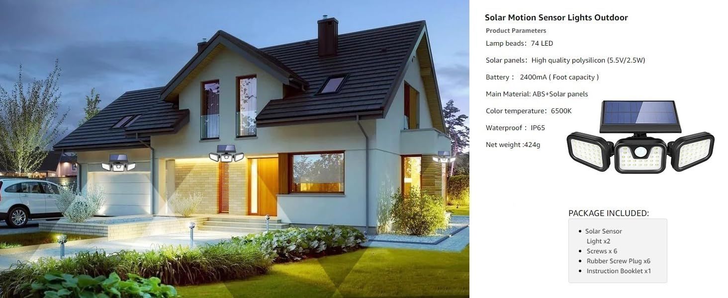 This solar motion sensor light features three adjustable lighting heads, offering a 270° wide illumination angle to cover a larger area. The high-efficiency solar panel fully charges in about 6 hours of sunlight, providing up to 10 hours of powerful 6000K bright lighting at night.
