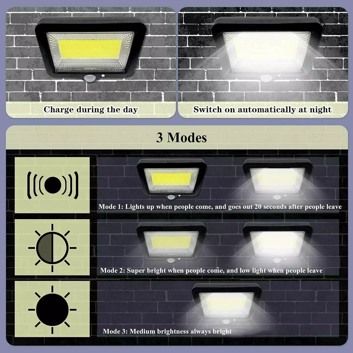 Outdoor solar light with 3 modes: Mode 3 (recommended) – off when idle, full brightness on motion. Mode 2 – dim light + motion sensor. Mode 1 – constant night light. Ideal for garden security lighting.
